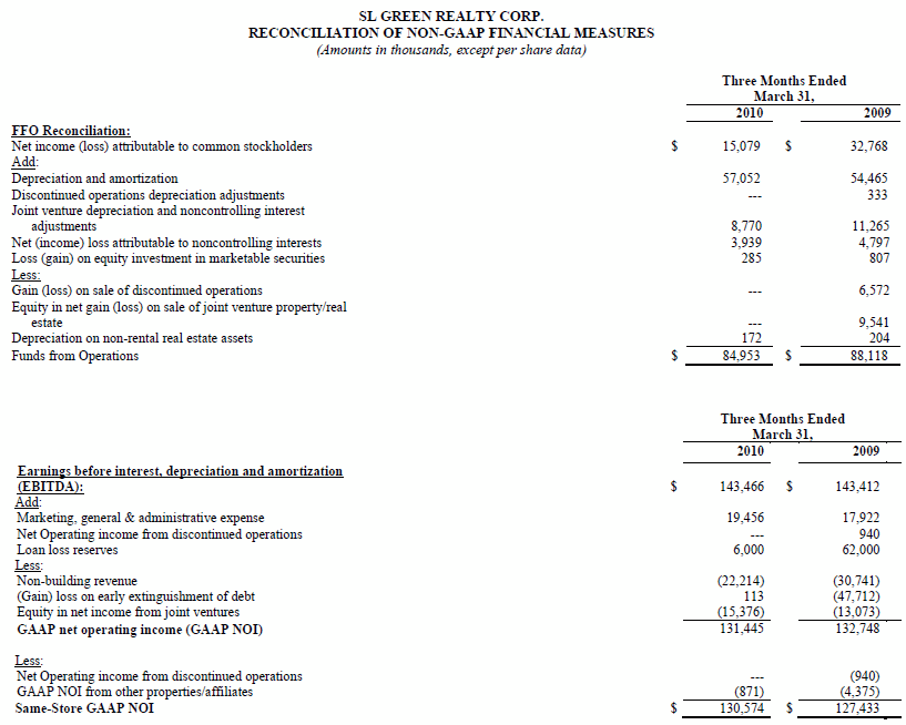 New York, NY, April 26, 2010 - SL Green Realty Corp. (NYSE: SLG) today reported funds from operations, or FFO, of $85.0 million, or $1.07 per share (diluted), for the quarter ended March 31, 2010, compared to $88.1 million, or $1.48 per share (diluted), for the same quarter in 2009.