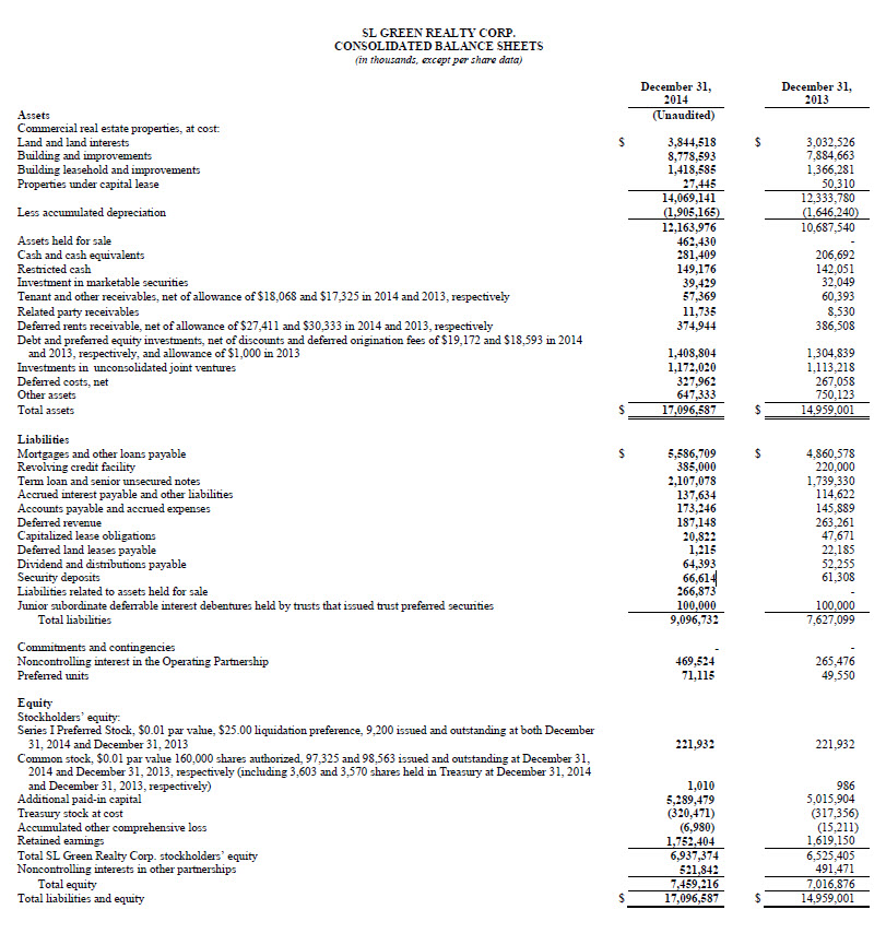 SL Green Realty Corp., New York City's largest office landlord, is a fully integrated real estate investment trust, or REIT, that is focused primarily on acquiring, managing and maximizing value of Manhattan commercial properties. As of December 31, 2014, SL Green held interests in 101 Manhattan buildings totaling 42.4 million square feet. This included ownership interests in 28.0 million square feet of commercial buildings and debt and preferred equity investments secured by 14.4 million square feet of buildings. In addition to its Manhattan investments, SL Green held ownership interests in 36 suburban buildings totaling 5.9 million square feet in Brooklyn, Long Island, Westchester County, Connecticut and New Jersey.